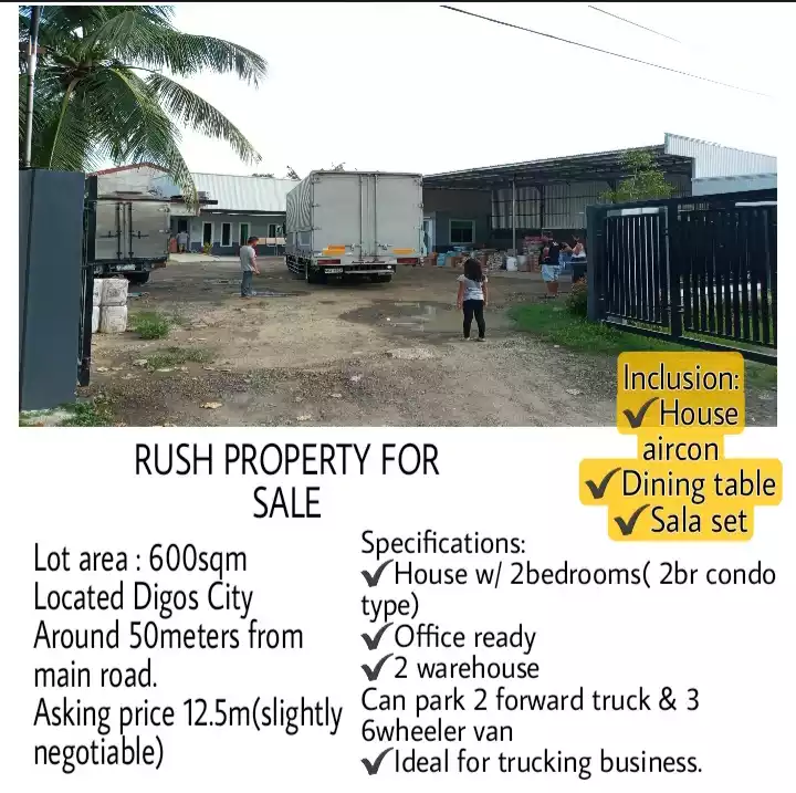 RUSH! RUSH! RUSH! PROPERTY FOR SALE Lot area : 600sqm Located Purok Cadios, Lim Extension Digos City Around 50meters from main road. Asking price 12.5m(slightly negotiable) Specifications: House w/ 2bedrooms( 2br condo type) Office ready 2 warehouse ( open & close) Can park 2 forward truck & 3 6wheeler van Ideal for trucking business. Inclusion: House aircon Dining table Sala set
