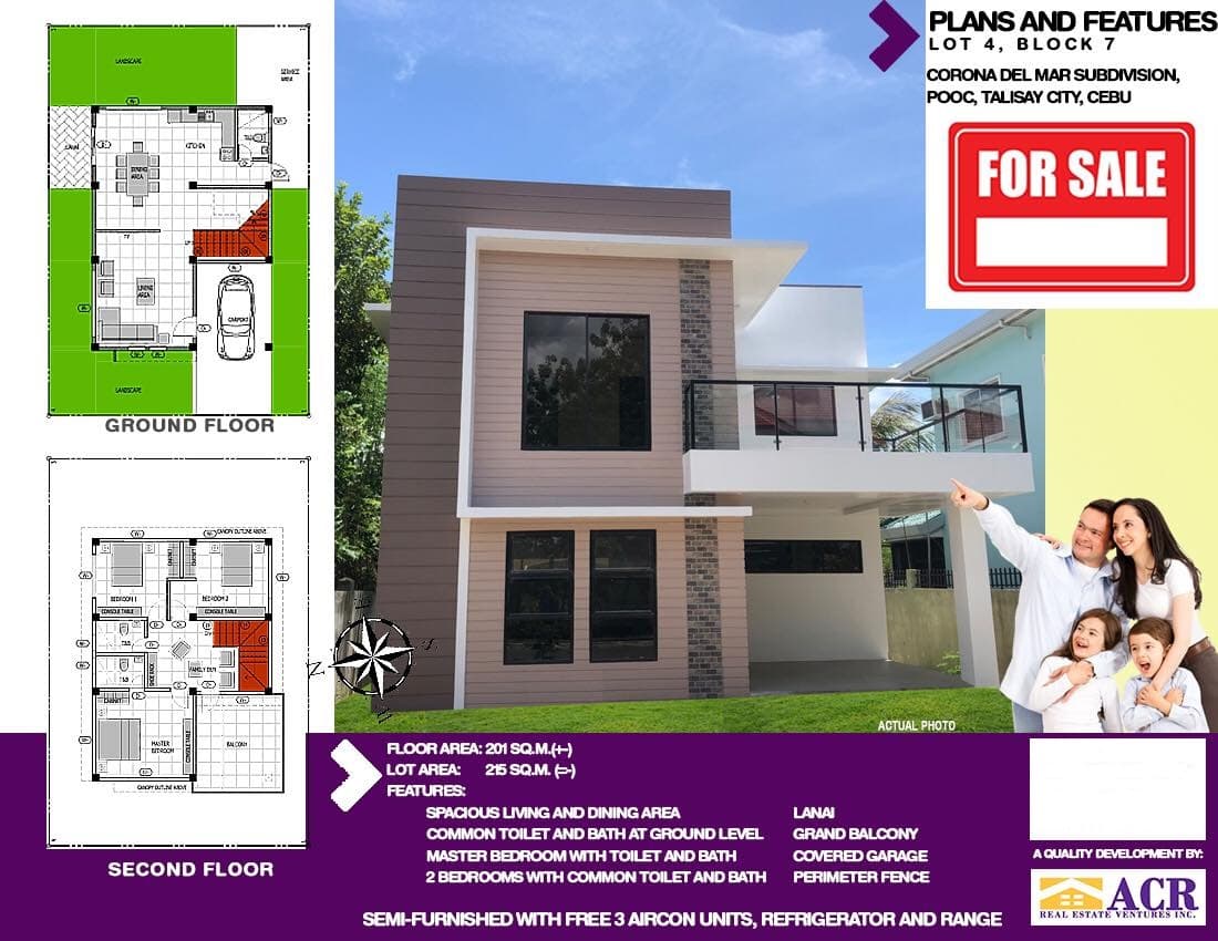 Floor Area: 201 sqm Lot Area: 215 sqm FEATURES: - Spacious living and dining area - Common Toilet and Bath at ground level - Master's bedroom with toilet and bath - 2 bedrooms with common toilet and bath * Lanai * Grand Balcony * Covered garage * Perimeter Fence