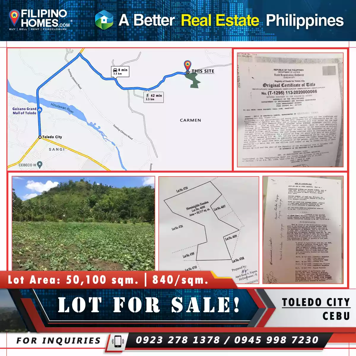 LOT FOR SALE! Carmen, Toledo City, Cebu Lot Area: 50,100 sqm. (5.1 Hectares) 840 per square meter. __Along Brgy. Road __8 min. From Toledo City to location site. ______________ Inquire now! ______________ #FilipinoHomes #ABREP #ABetterRealEstatePhilippines #PRC"Accredited" #DHSUD No. R7-A-12/20-5721 For inquiries, Site viewing, Pm or Call... (Sun) 0923 278 1378 (Globe) 0945 998 7230